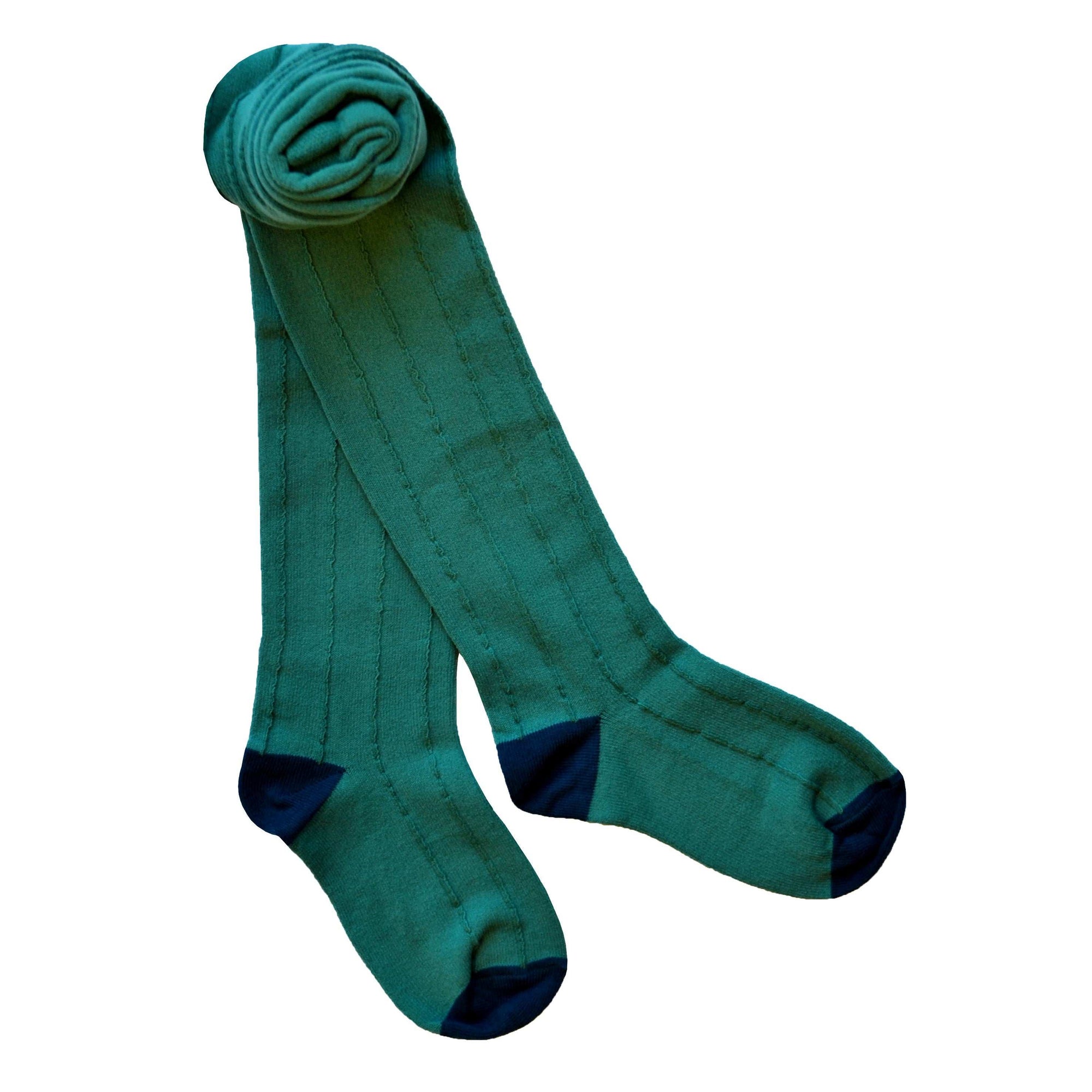 Coloridos leotardos verdes ideales para realtar el look. Tienen detalles en la forma de las costuras y tonos azul oscuro en la zona del talón y los dedos de los pies.