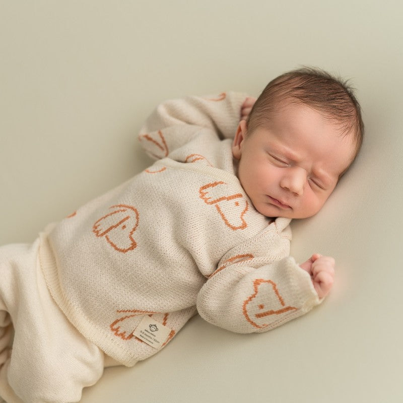 ¡Hola, familias amantes de los animales! Este conjunto de primera puesta de Micu Micu es un flechazo inmediato. Es la combinación perfecta entre la ternura del estampado de perritos y la tranquilidad de vestir a vuestro bebé con una pieza de artesanía local, totalmente respetuosa con la piel y con el planeta.