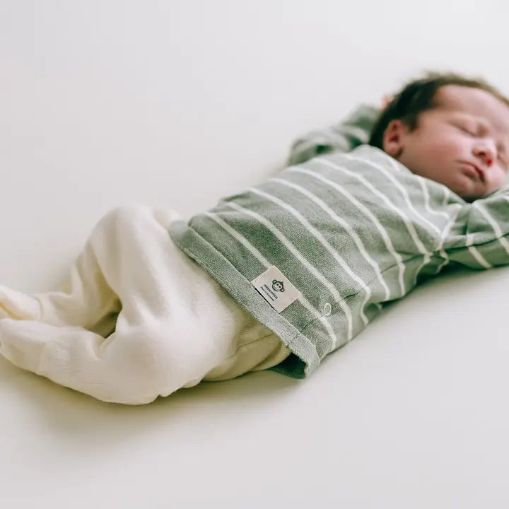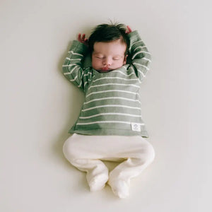 Top/Jersey Rayas: Con un alegre patrón de rayas en Verde Salvia y Crema, es la pieza protagonista. El diseño cruzado facilita ponerlo sin molestar al bebé.