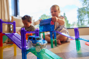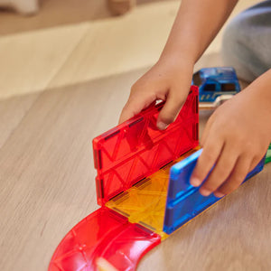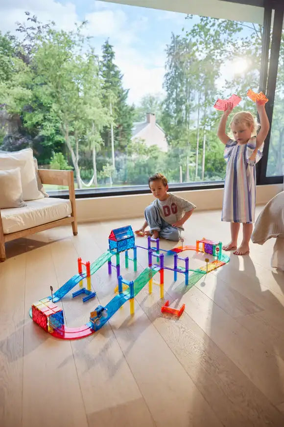 Descubre el Race Track de Cleverclixx con 65 piezas magnéticas diseñadas para crear emocionantes circuitos de carreras. Construye pistas con curvas, rectas y elevaciones para hacer rodar coches y bolas, combinando construcción magnética con la emoción de las carreras.