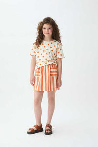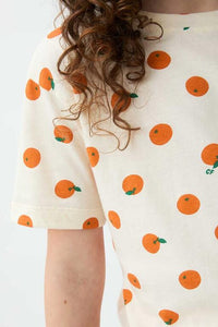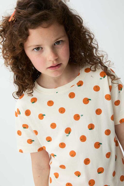 Camiseta de manga corta con cuello redondo y estampado de pequeñas naranjas, perfecta para looks frescos y divertidos. Diseño cómodo en algodón 100%.