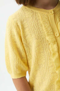 Este cárdigan destaca por su punto calado que crea un patrón muy original, su manga corta perfecta para entretiempo y un delicado volante junto a los botones que añade un punto de elegancia y sofisticación. El color amarillo vibrante ilumina cualquier conjunto.