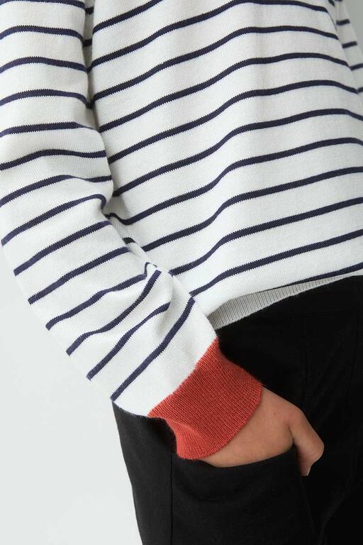 Jersey fino de rayas con cuello rojo de Compañía Fantástica Mini, la línea infantil de la reconocida marca española Compañía Fantástica. Una prenda ligera y divertida que combina el clásico estampado de rayas con un toque de color vibrante en el cuello.