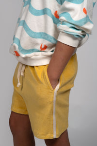 Cómodos shorts de toalla en un original coolor amarillo, perfecto para la playa, la piscina o los días de verano. Confeccionado en 100% algodón orgánico de rizo suave y absorbente, este short combina comodidad, funcionalidad y estilo.