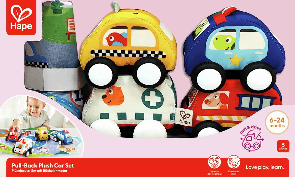 Descubre el set de coches más adorable y seguro para los peques: 3 coches de peluche suave con mecanismo de retroceso (pull-back) y un circuito de tela para crear carreras emocionantes. Estos coches blanditos son perfectos para las primeras carreras, combinando la diversión de los vehículos de juguete con la seguridad y suavidad del peluche.