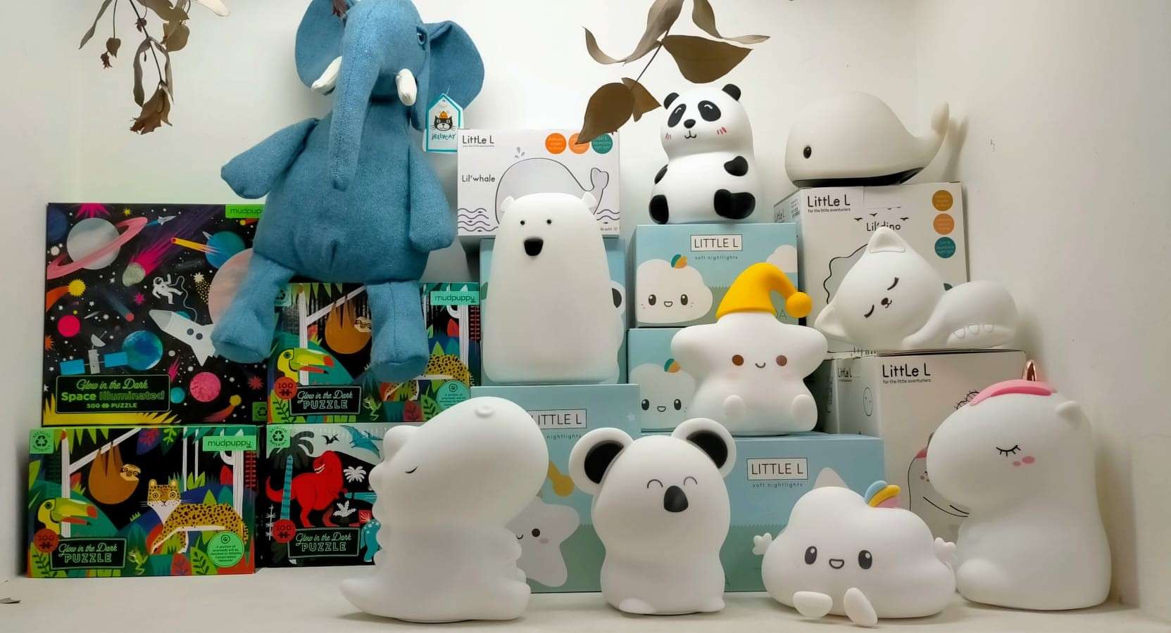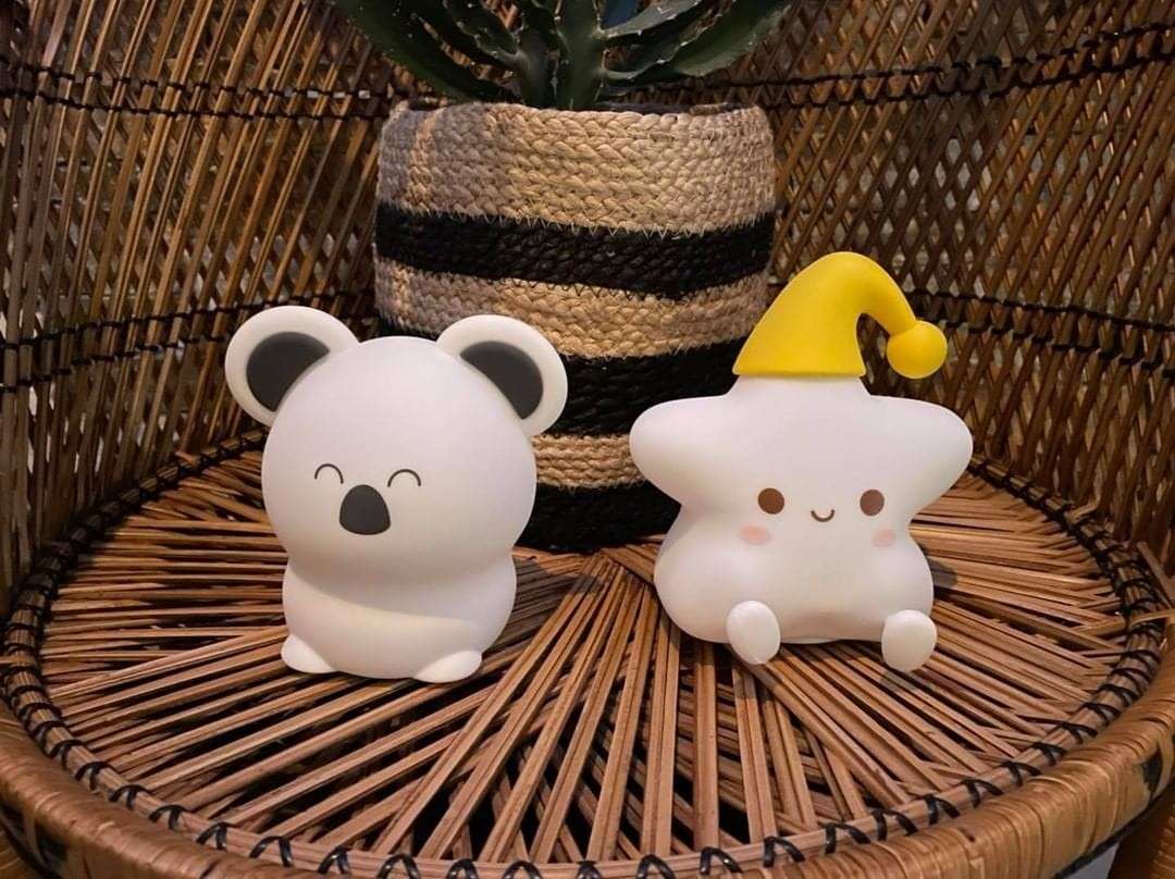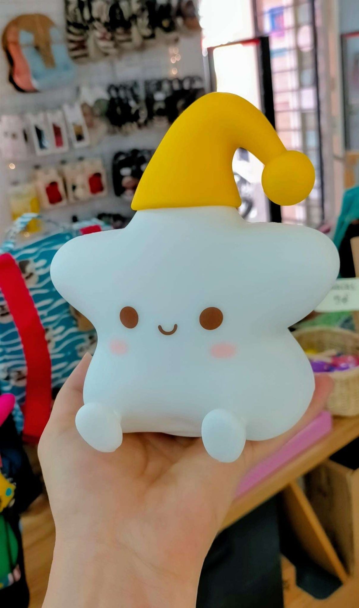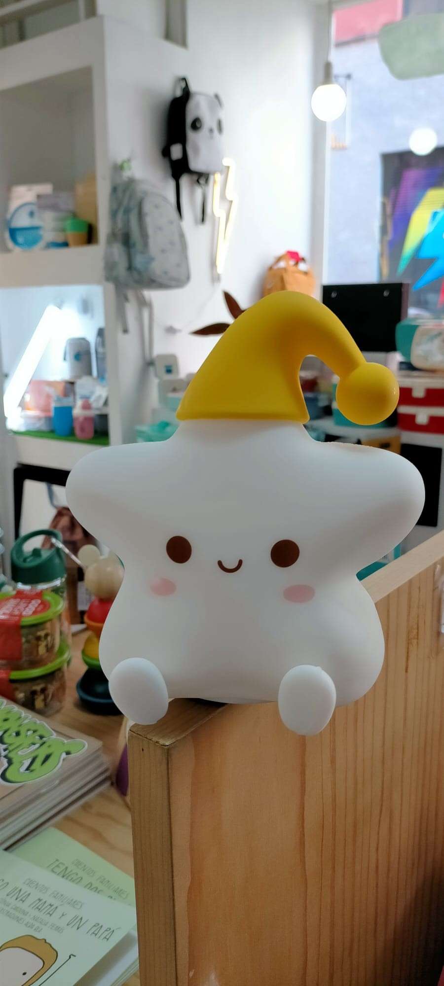 Lámapara quitamiedos en forma de estrella con gorrito amarillo, es de silicona blandita, recargable mediante USB y varias opciones de iluminación: Luz blanca fija, luz cambiante de colores y luz fija de un color. Se cambia de un color a otro golpeando suavemente la lámpara.