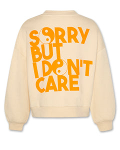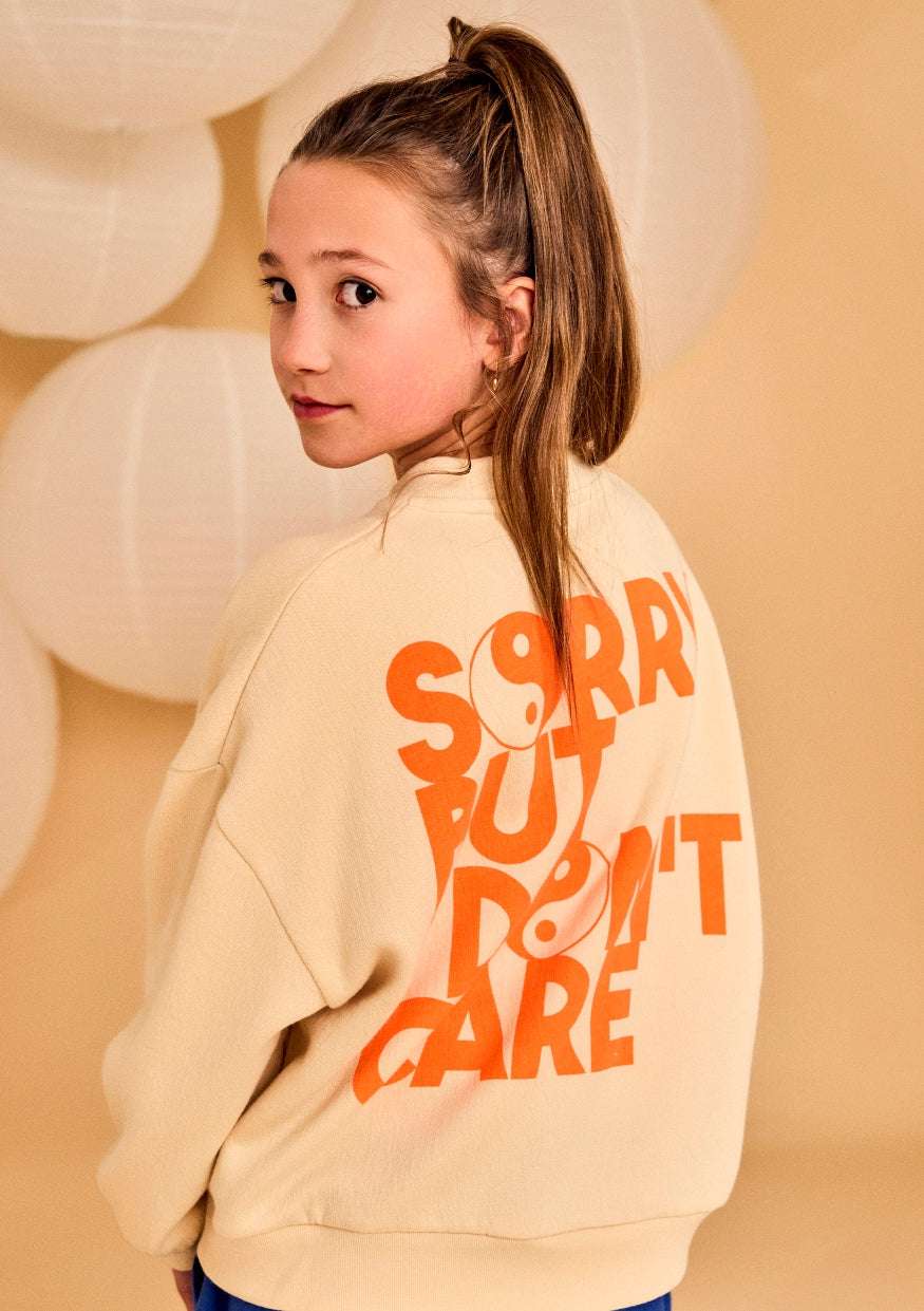 De color crudo con un detalle vibrante en la espalda —el mensaje “Sorry but I don't care” en naranja neón—, esta prenda se convierte en una declaración de estilo juvenil y atrevido. Su corte holgado y ligeramente más corto le da un aire moderno y desenfadado, ideal para combinar con vaqueros o pantalones jogger.
