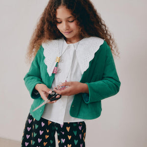 Este pantalón largo de Compañía Fantástica Mini combina comodidad y diversión gracias a su original estampado de pequeños corazones de colores sobre fondo negro. Con un corte recto y relajado, es perfecto para jugar, ir al cole o crear looks creativos sin renunciar a la comodidad.