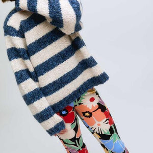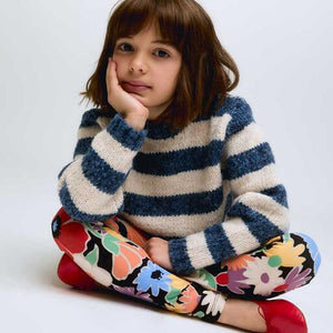Confeccionado en un punto grueso, suave y cómodo, este jersey unisex en azul y blanco es perfecto para abrigar a los peques en los días más fríos. Su diseño clásico de rayas marineras lo convierte en una prenda versátil, ideal tanto para looks informales como para combinar con faldas, pantalones o leggings.
