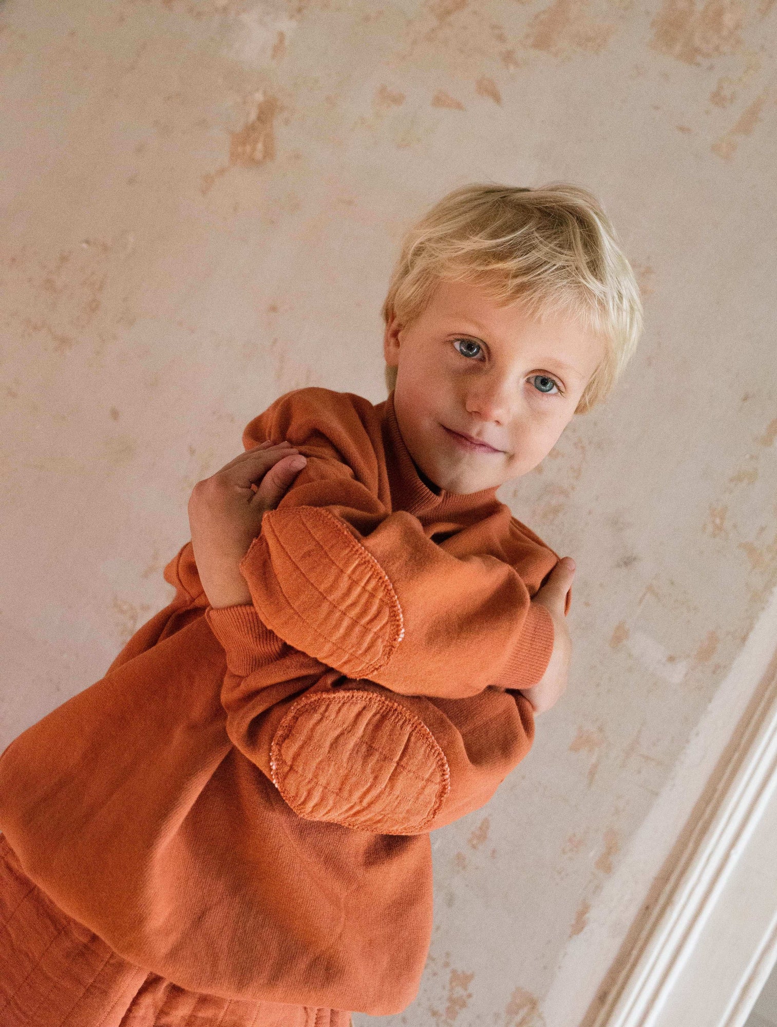 En un elegante tono arcilla (clay), destaca por sus coderas al tono y un bordado de un perro con sombrero en el pecho, detalle divertido y sutil que la hace especial. Su diseño con cuello redondo, manga larga y corte ligeramente oversize permite libertad de movimiento y combina fácilmente con leggings, vaqueros o faldas.
