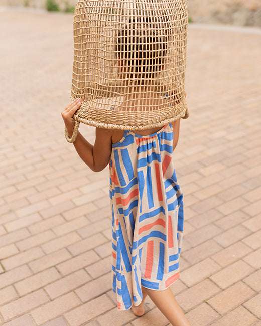 El estampado en base neutra donde da protagonismo a las figuras geométricas azules y rojas, dan un toque veranigeo y especial.