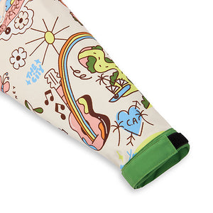 The Hello Hossy® San Francisco Rain Poncho fills rainy days with color and fun. Its San Francisco-inspired print combines streetcars, rainbows, musical notes, ice cream, and landscapes, all on a light background with a bright green front pocket.