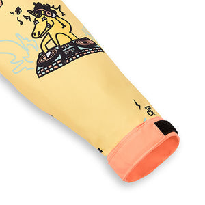 The Hello Hossy® Unicorn Rain Poncho will brighten up dull days with fantasy and color. Its cheerful print of unicorns playing with ice cream, floats, and rainbows on a yellow background brightens up any downpour. The peach-colored front pocket adds a practical and fun touch.