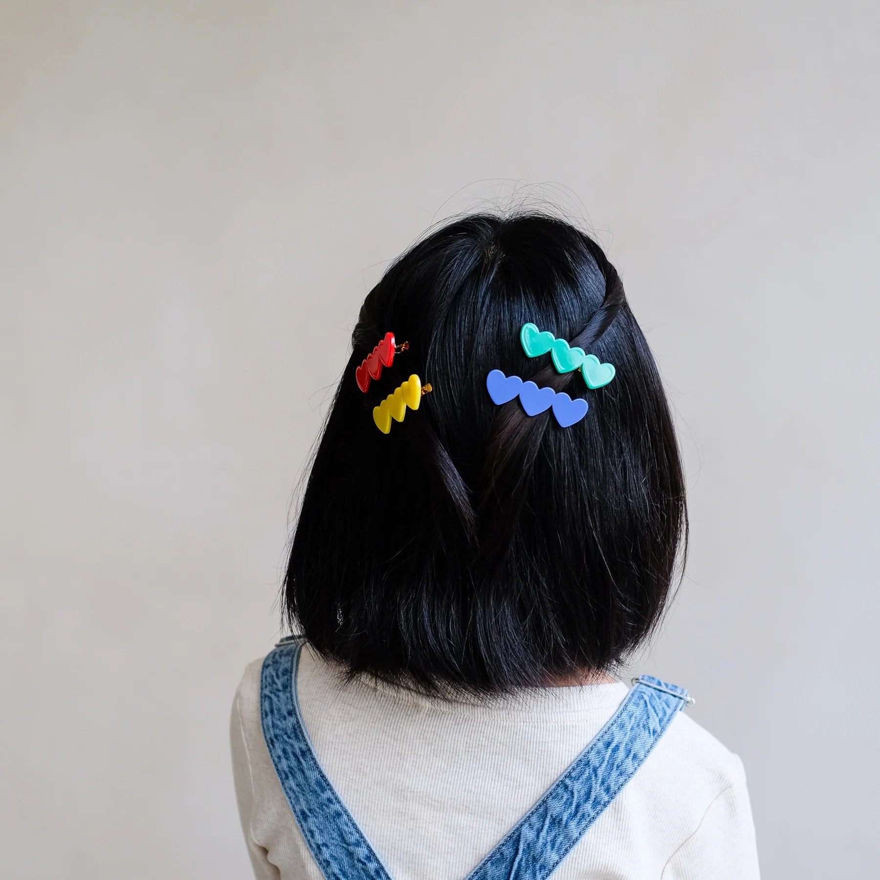 Cuatro corazones para el pelo que lo dicen todo sin decir nada. Las horquillas de acetato de Mimi & Lula llegan en colores vivos e intensos — rojo, amarillo, turquesa, lila — para llevar el pelo con actitud y mucho color.