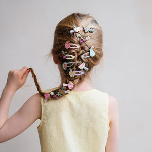 Una ensalada de frutas para el pelo. Las horquillas frutitas de Mimi & Lula vienen en pack de 8 — fresas, sandías, cerezas y manzanas — con detalles en glitter y acabados dorados que las hacen irresistibles.