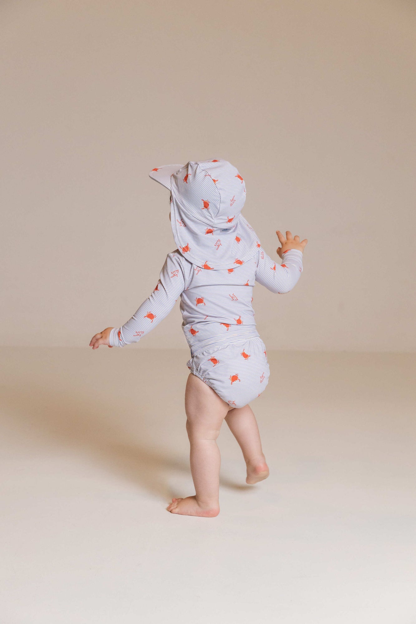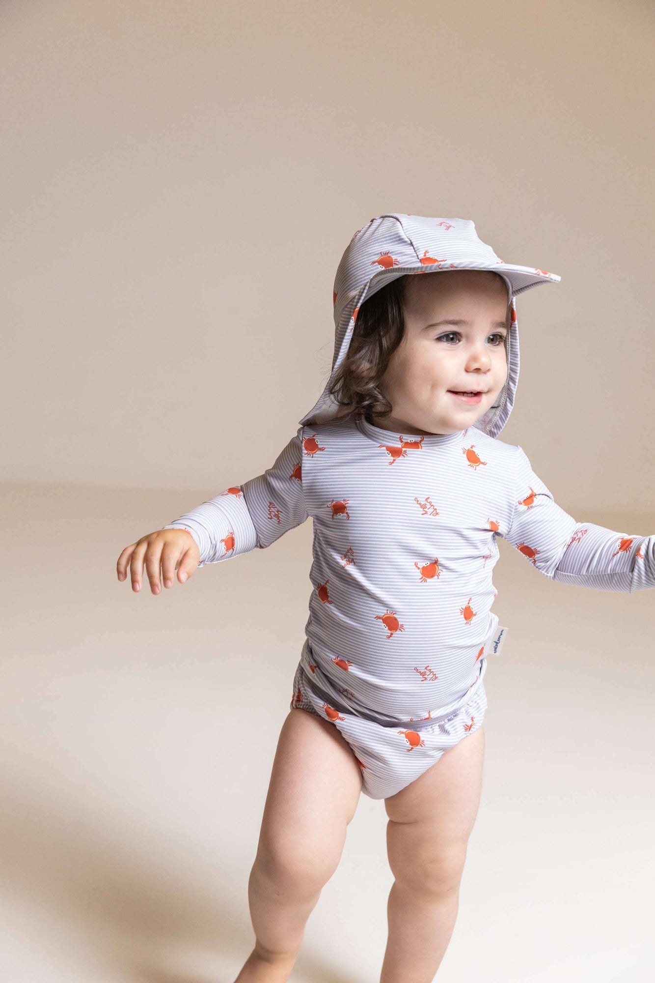Estampado de rayas y cangrejos sobre fondo color crudo y cinturilla elástica: una braguita pañal de baño cómoda, segura y con mucho estilo. Diseño original de Waterlemon, marca española con tejidos de alta calidad y prints que enamoran.