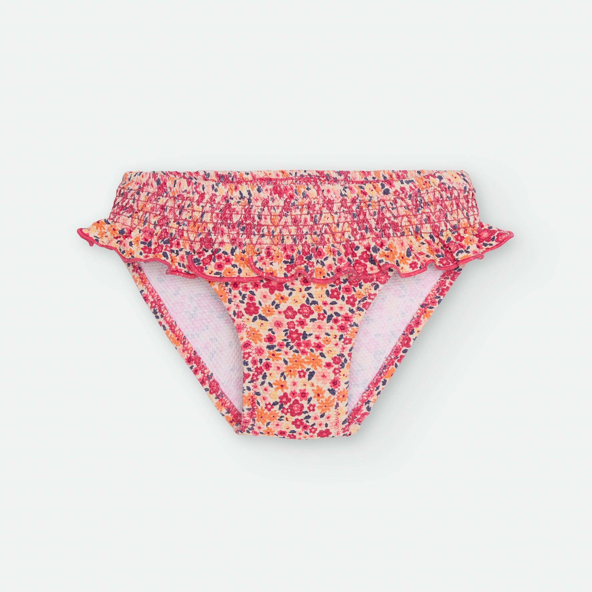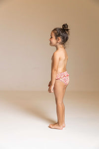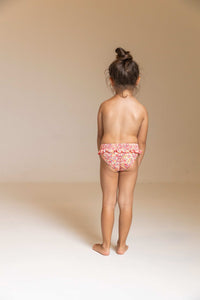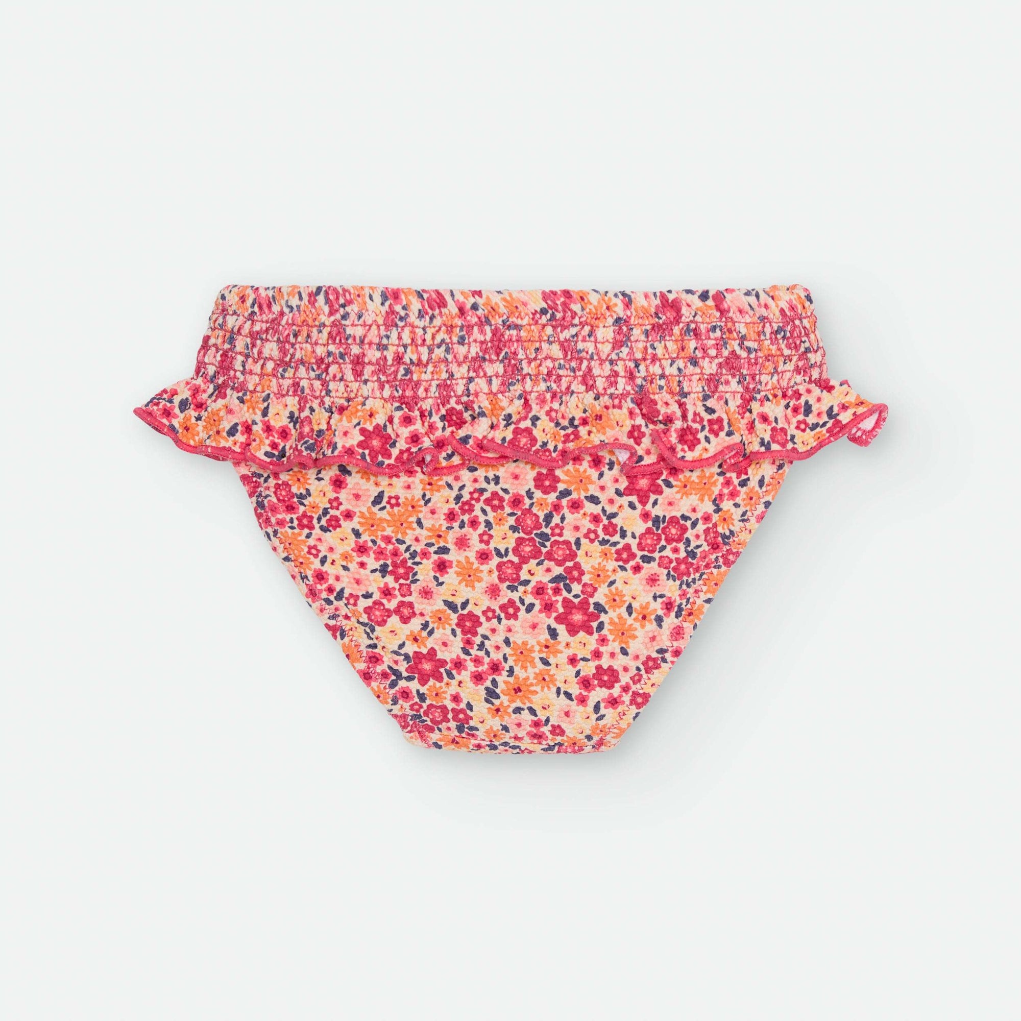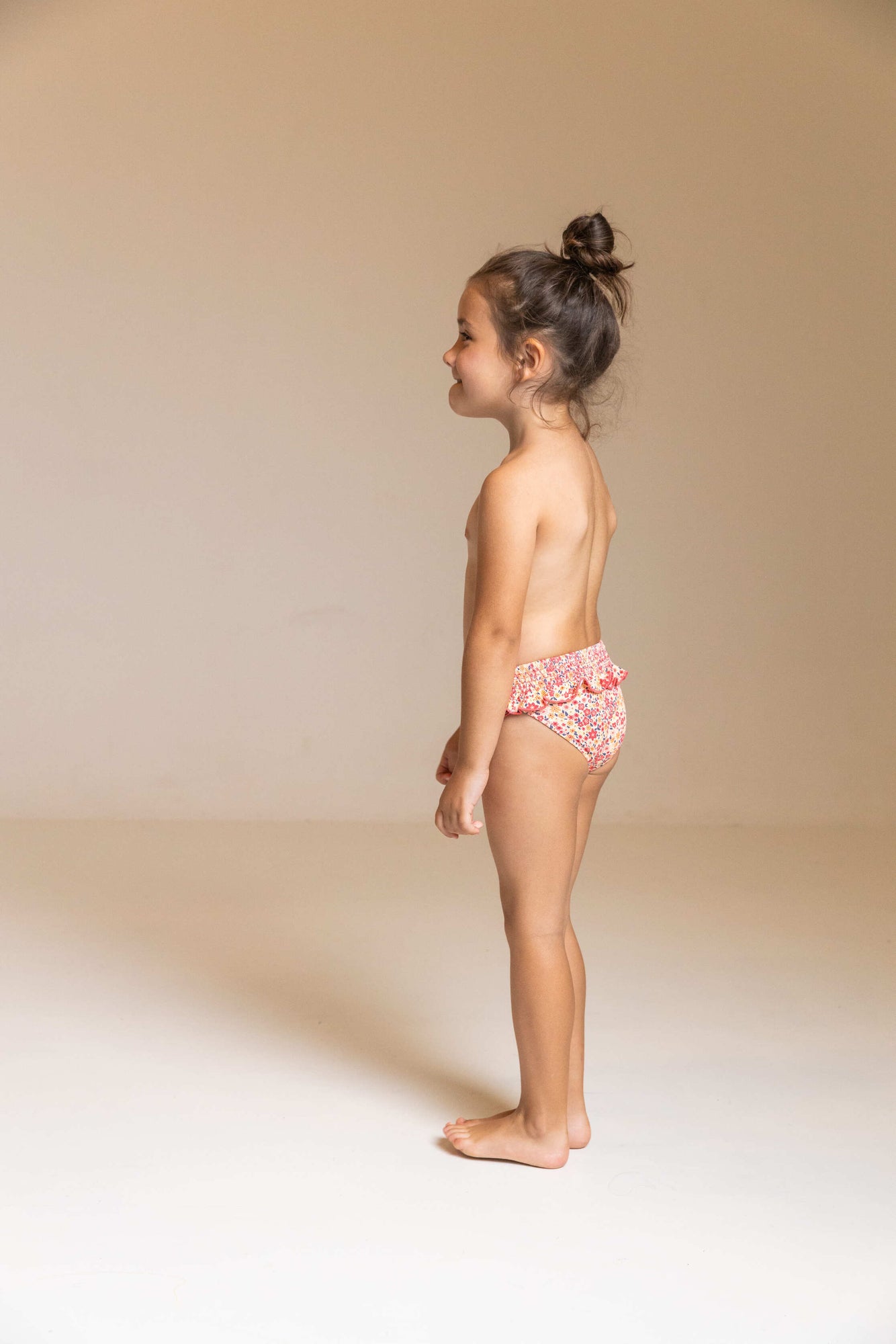 Tejido piqué con estampado de florecitas tipo liberty en tonos rojos sobre fondo crudo, cinturilla elástica y volante con detalle nido de abeja: una braguita de baño con mucho carácter y un acabado muy cuidado. Diseño original de Waterlemon, marca española con tejidos de alta calidad y prints que enamoran.