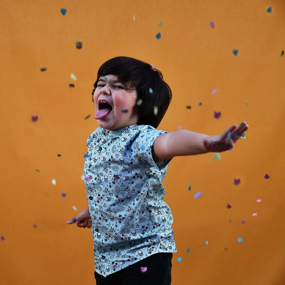This light blue organic cotton short-sleeved shirt, made in Spain from Oeko-Tex-certified organic cotton, is decorated with a fun print of mini skulls and classic tattoo motifs in black. Its unique and comfortable design makes it perfect for kids to show off their style with a bold and fun touch. Ideal for days filled with adventure and fun.