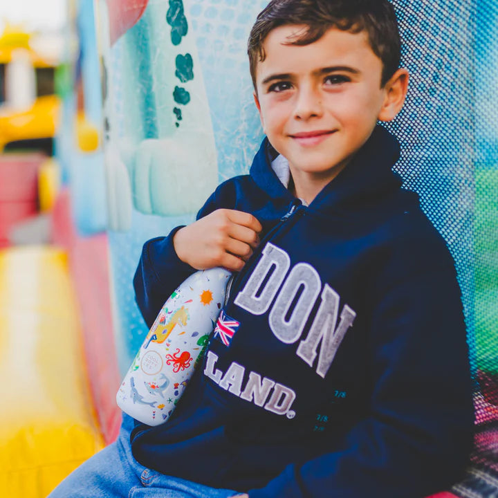 Double-walled steel insulated bottle with 2 caps: airtight screw cap and cap with flip-up spout and straw.