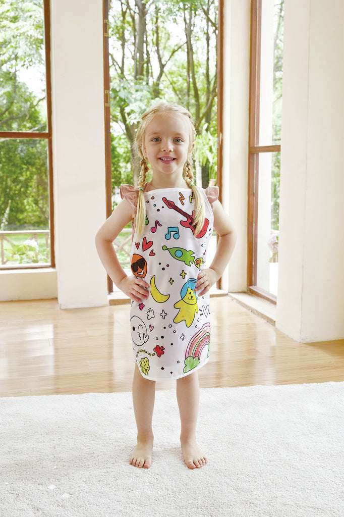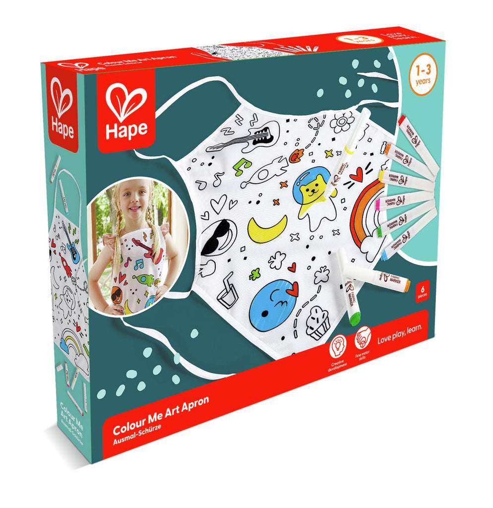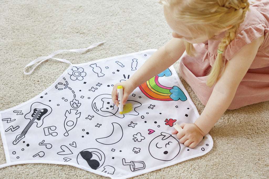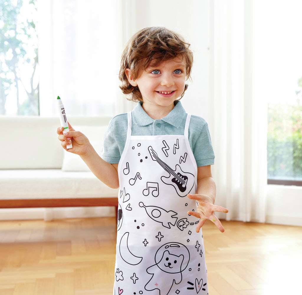 A practical and creative gift, a children's apron with fun drawings and fabric markers in different colours so they can create their own.