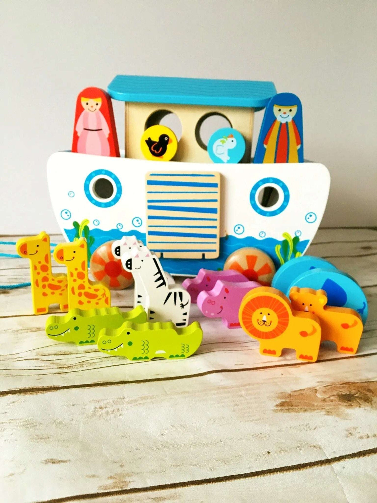 Bring the animals aboard Noah's Ark! Little ones can play with the included wooden animals or fit them into their corresponding places on the ark and take them for a ride. They'll have lots of fun with this toy while taking their first steps!