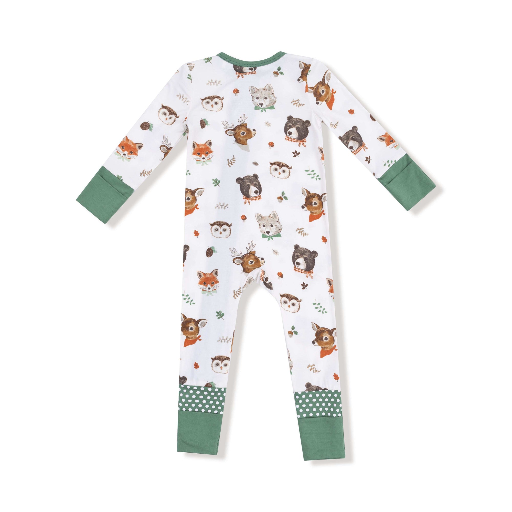 Angel Dear's Forest pajamas envelop every night with the magic of forest animals: bears, foxes, and owls mingle in a tender print on an ivory background with green trim.