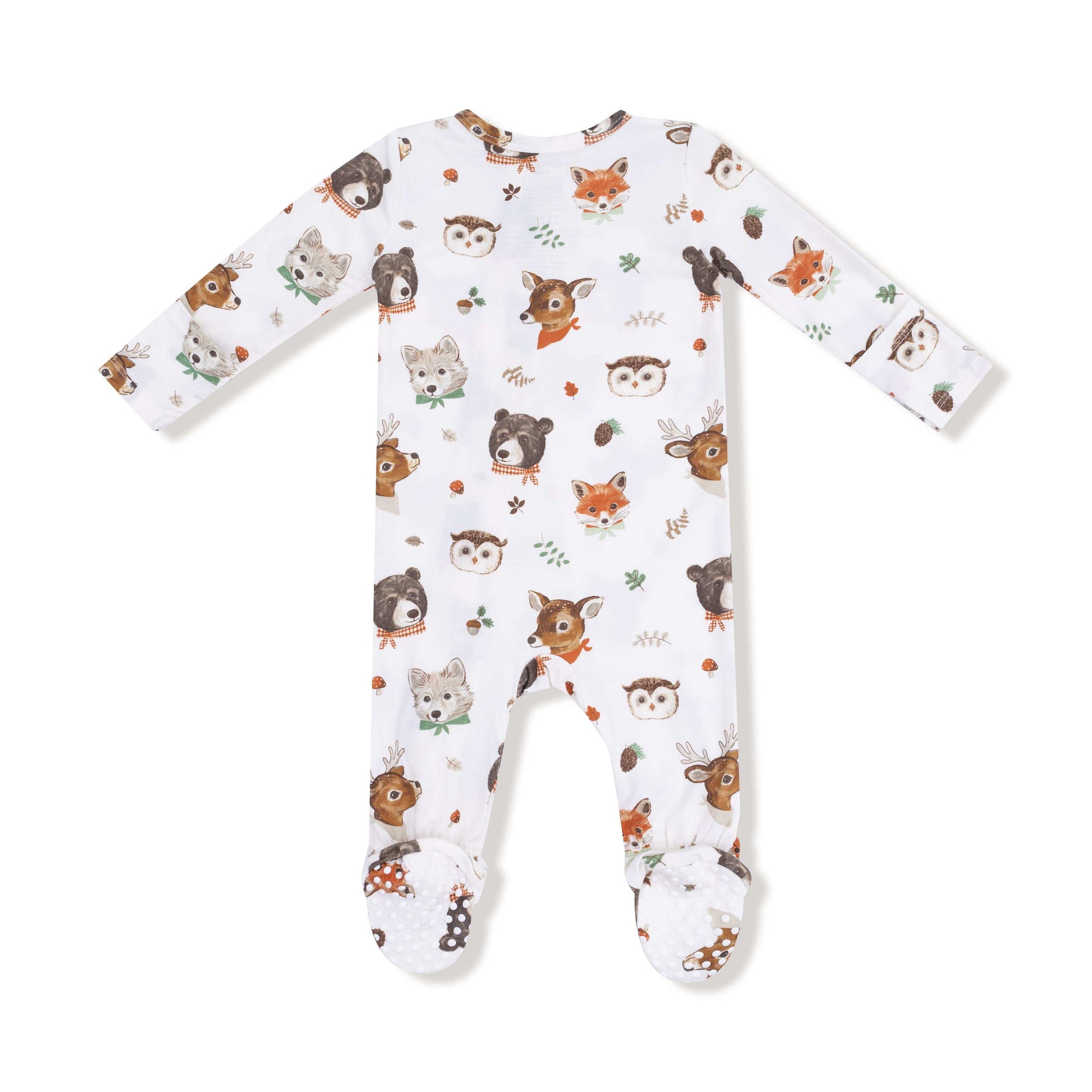 Inspired by the serenity of the forest and its inhabitants, this ultra-soft bamboo footed sleeper from Angel Dear wraps baby in warmth and comfort. Its charming print features owls, bears, and foxes among leaves and trees, in soft, natural tones.