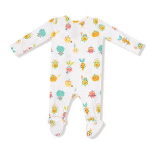 Healthy bedtime fun! These soft and stretchy bamboo footed pajamas from Angel Dear are full of energy with their original print of sporty vegetables: carrots running, radishes lifting weights, and broccoli in action.