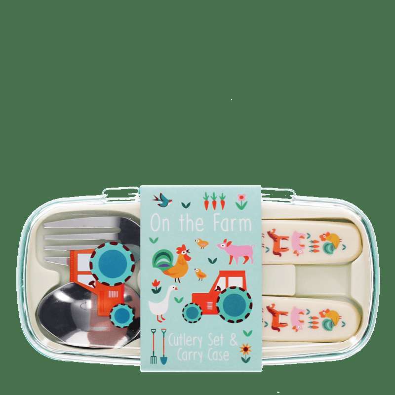 The handle is comfortable and made of plastic, featuring tractor and farm animal illustrations. The utensils are made of stainless steel.