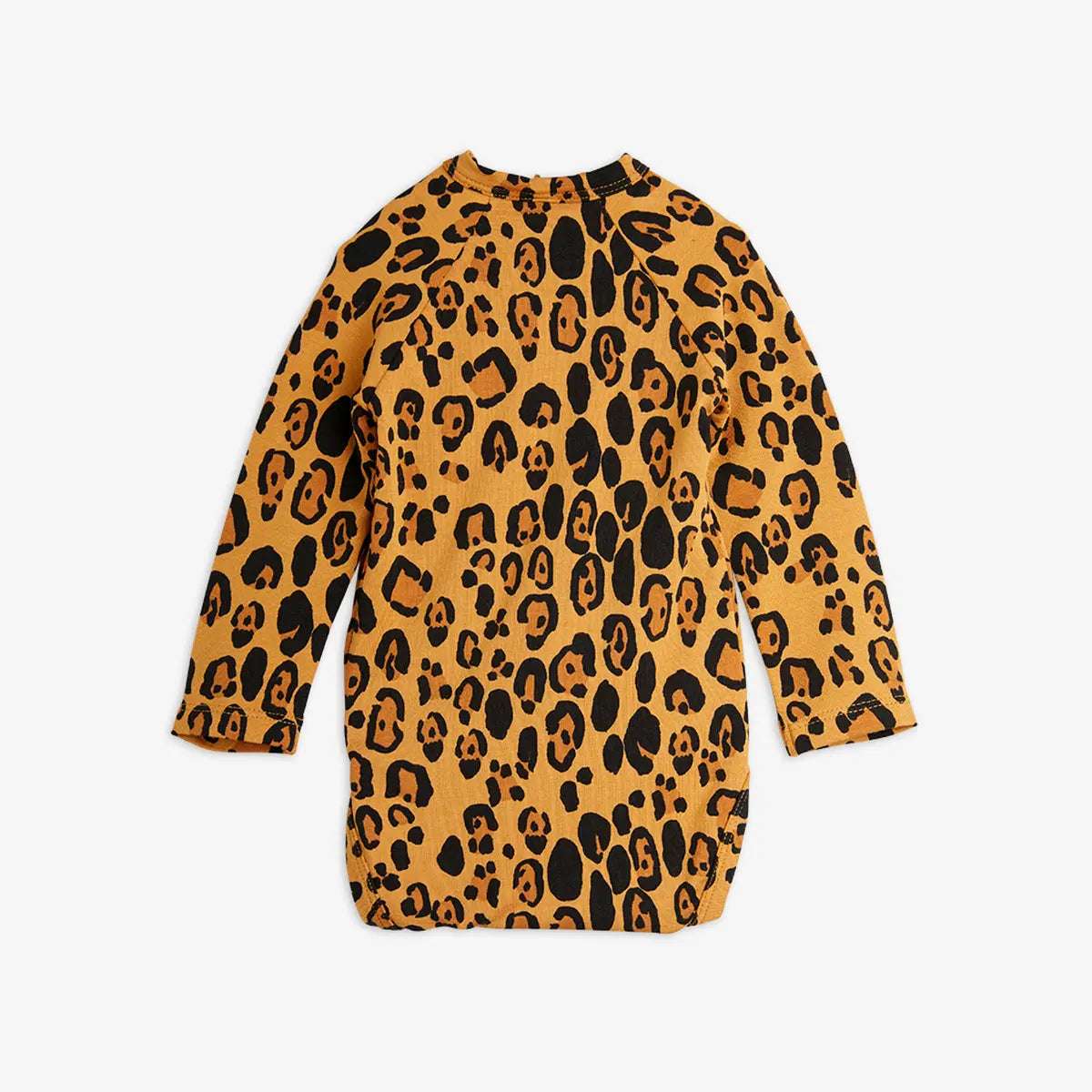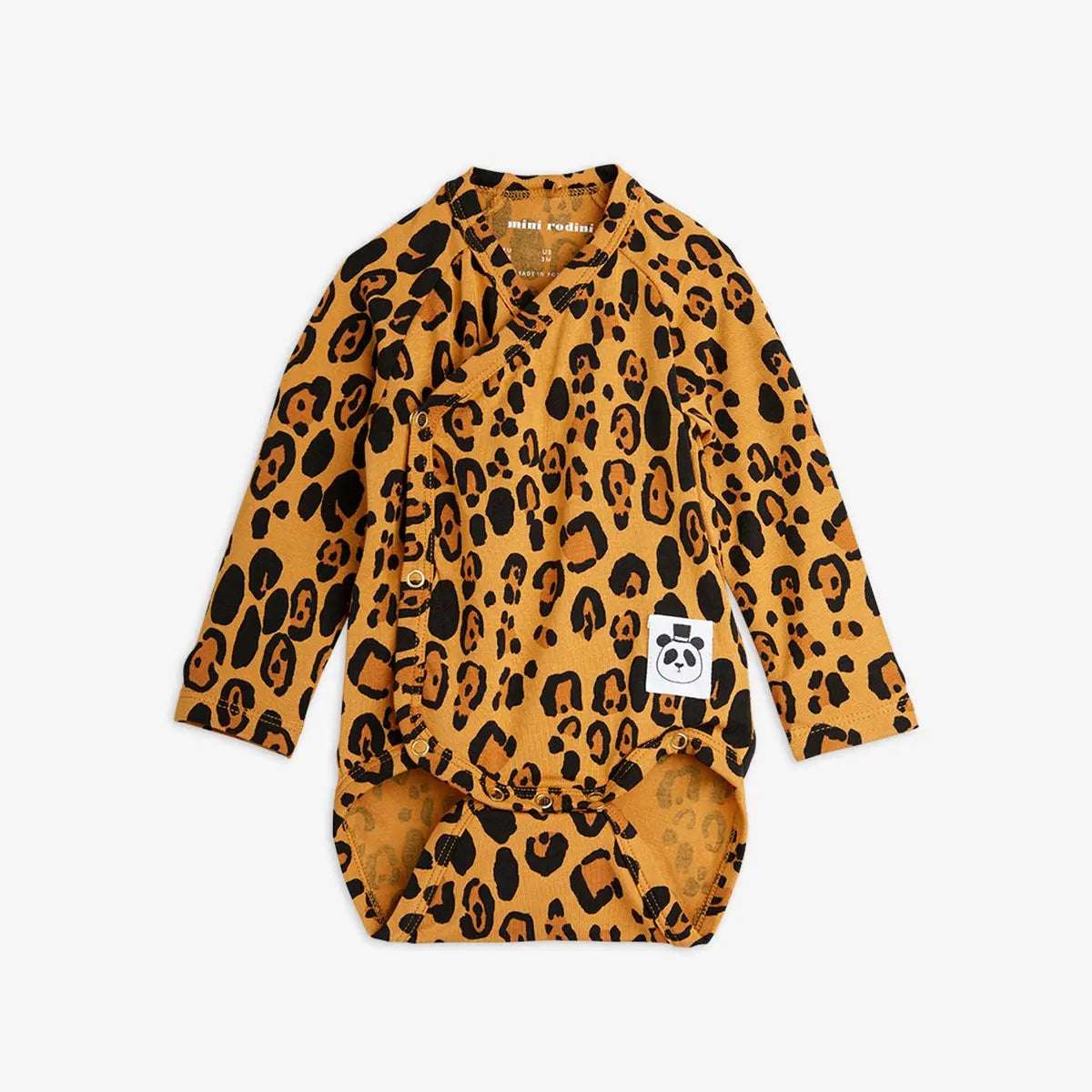 Leopard print wrap bodysuit, made from soft TENCEL™ Lyocell with a touch of stretch for extra comfort. The bodysuit is designed in Mini Rodini's newborn style and features a Mini Rodini panda label on the front. Snap buttons on the front and crotch make it easy to wrap the garment around your baby instead of putting it on over their head.