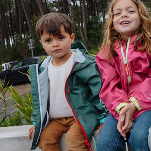 Made from certified waterproof fabric (80% polyester, 20% thermoplastic polyurethane) , it keeps little ones dry and comfortable, while remaining lightweight and comfortable. Its design includes a hood , elastic cuffs , an adjustable drawstring hem , two side pockets , and a front zip closure, designed to withstand rainy adventures.
