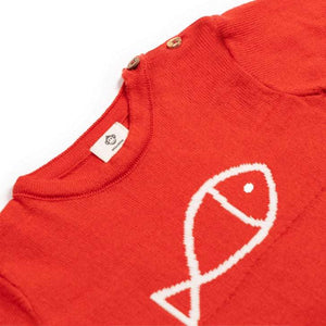 This adorable red fine-knit sweater with a cute white fish on the front is ideal for little ones. Made from organic cotton, it's soft, breathable, and gentle on baby's skin. Its cheerful and original design makes it a perfect choice for any occasion.