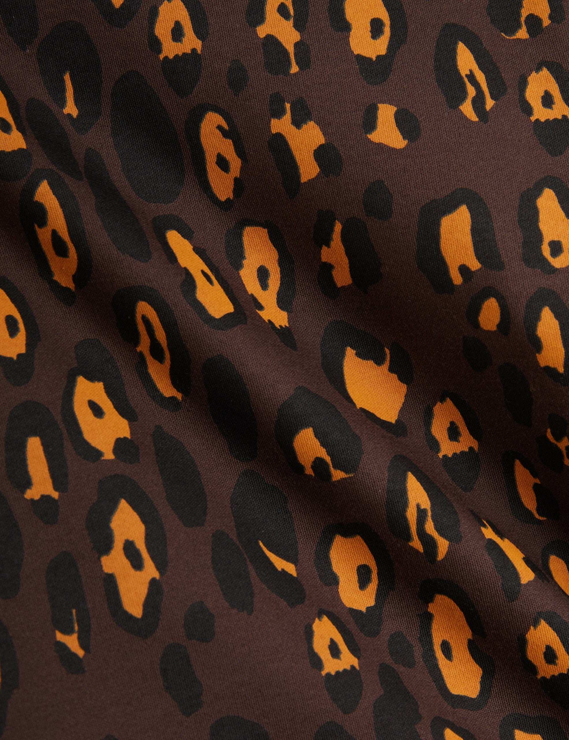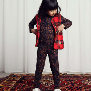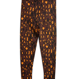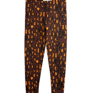 Brown eco-friendly leopard print leggings by Mini Rodini, available at Älva for Kids. These leggings feature a striking leopard print in warm brown tones, perfect for adding a touch of wild style to any outfit. Made from a blend of GOTS-certified organic cotton and elastane, they offer a brushed texture that feels incredibly comfortable against the skin. The fabric provides excellent stretch, ensuring a snug fit that adapts to your little one's movements, making them perfect for play, casual outings or lounging around the house.