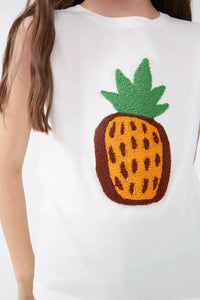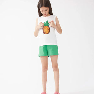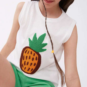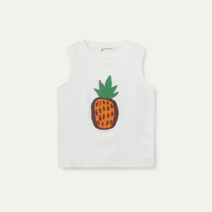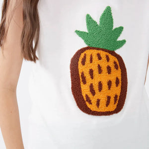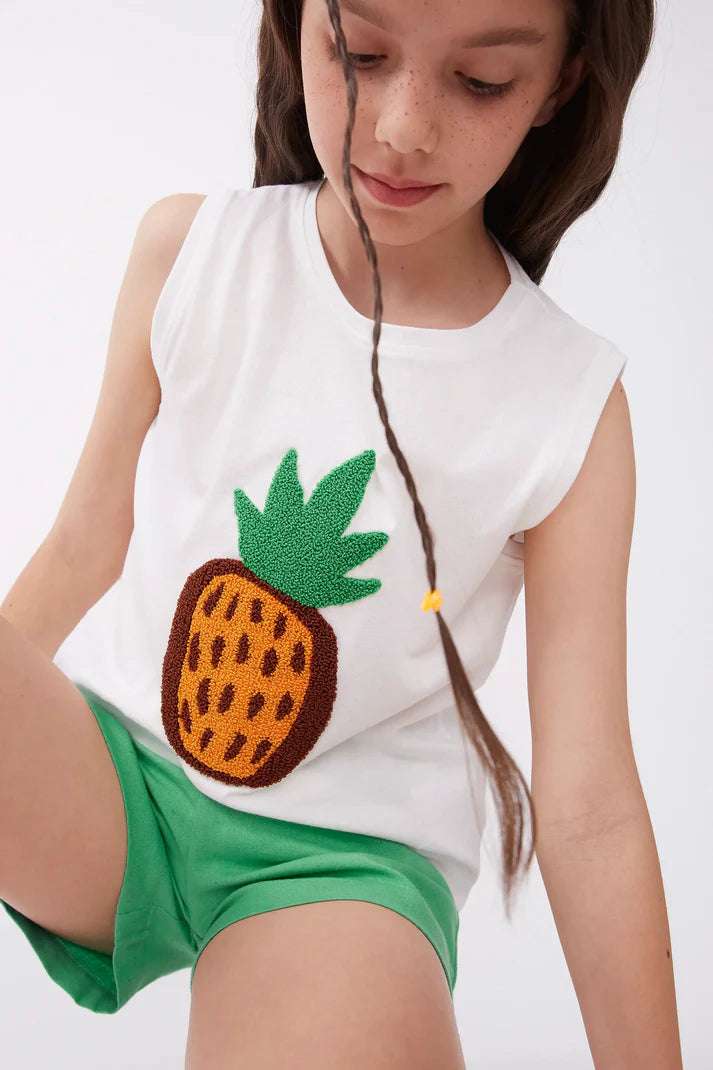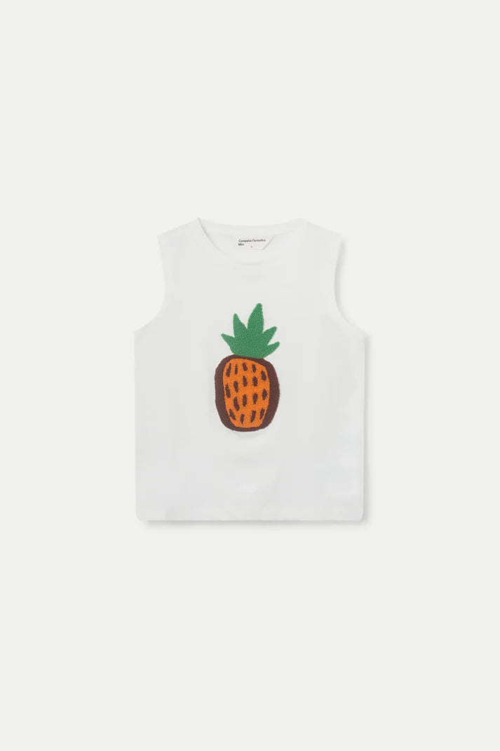 Añade un toque divertido y tropical al armario infantil con esta camiseta sin mangas de Compañía Fantástica. Confeccionada en suave algodón blanco, presenta un original aplique de piña en relieve con textura que encantará a peques curiosos. Su diseño sin mangas y corte recto la convierten en una prenda fresca, cómoda y perfecta para los días de calor. Ideal para combinar con shorts, faldas o pantalones ligeros en looks veraniegos llenos de color.