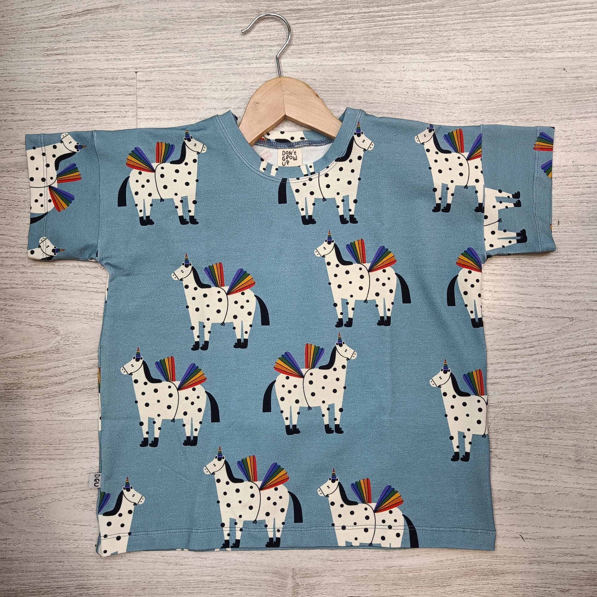 Camiseta azul clarita de algodón orgánico estampado de unicornios arcoíris – Don't Grow Up
