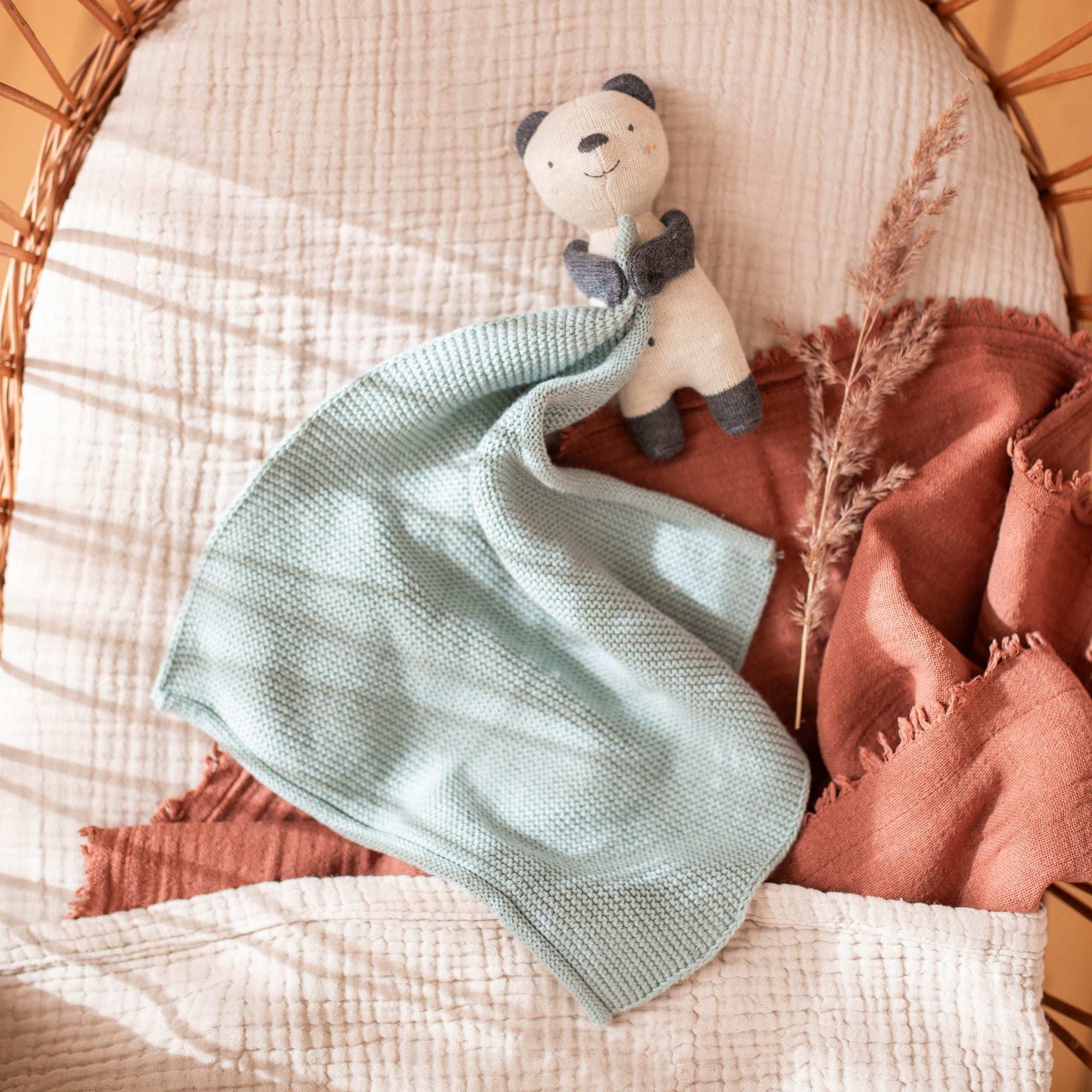 Este doudou de punto de algodón consiste en un panda beige y gris oscuro con su trapito verde menta.